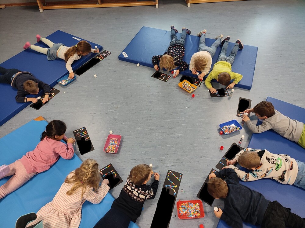 Heute haben die Eulenkinder/ Vorschulkinder ganz entspannt auf ihren Matten im Turnraum gebastelt und mit bunten Papierschnipsel ihren Namen gestaltet.